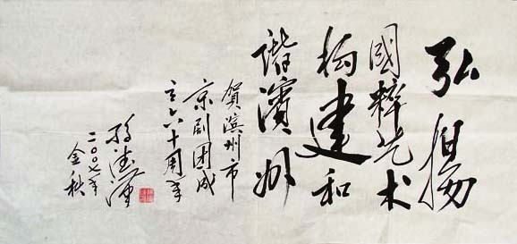 滨州市京剧团(原中国人民解放军渤海军区政治部京剧团)建团于战火纷飞的1947年11月。至1952年渤海军区撤销,剧团于同年9月集体转业归德州专署,易名德州专署京剧工作团;1953年集体调至惠民专署,改称惠民专署实验京剧团;1958年4月集体下放至滨县,易名滨县京剧团;同年10月30日惠民专署与淄博专署合并,剧团改称淄博专署京剧团(驻专署住地张店);1961年1月,淄博、惠民两地分开,恢复惠民专署建制,剧团易名惠民专署京剧团、惠民地区京剧团;1992年7月,经国务院批准惠民地区改为滨州地区,剧团易名滨州地区京剧团;2000年6月,滨州地区改为滨州市,剧团称谓亦随之改变—滨州市京剧团。屈指算来,至2009年,剧团在发展、提高中已度过了62个春秋。 滨州市京剧团现人员编制65人,在编人员63人。其中国家一级演员6人,一级演奏员7人,二级演员9人,二级演奏员3人,中级职称以下人员34人。追朔到20世纪40年代,建国之初,剧团系部队编制生活待遇保持原部队时的供给制,1953年下半年执行工资制。剧团80余人,团长郭明,副团长隋长胜、李长生。主要演员有杜同庆(武生、黑红二净)、崔蕴芳(男旦,人称“假梅兰芳”、“水长虫”)、司风景(老生)、张长庆、关恩山、孙同祥(武净)、耿长春(文武老生)、蒋海亭(海派老生)、王之祥(老生)、胥玉福(武净);一般演员有耿慧君(女)、孙世杰(女)、胥玉荣(女)、侯玉山、侯玉堂、侯玉莲、侯玉朋、牟松坡等。司鼓郭象三、刘吉祥;操琴毕玉起、陈光宗、薄林萍。以演出新编历史剧为主,如:《黄巢》(一、二部)、《九件衣》、《逼上梁山》、《三打祝家庄》、《关羽之死》、《皇帝与妓女》、《廉颇与蔺相如》、《双蝴蝶》、《鱼腑山》、《白娘子》等。 当时,解放战争炮火连天,硝烟弥漫,环境十分恶劣。剧团随军作战,战火中演出场地离战场很近,枪炮声听得很清楚。为了防空,事先在舞台上对准两盏汽灯挖好坑,听到防空警报立即把汽灯落入坑内,以免暴露目标。有时正在演出,敌人进攻了,就马上转移。还经常派演员到连队教唱歌曲《蒋介石你这个坏东西》、《打得好》、《八路军军歌》、《解放区的天是明朗的天》等,鼓舞官兵士气。战争年代,部队生活艰苦,工作紧张,排练之余,剧团还承担救护伤员的任务。有一次在执行任务时,一伤员死在年近12岁的小演员侯玉山(现为国家二级演员,已离休)的背上。随军作战行军,最多时一夜步行一百四十华里。 1949年秋季,渤海区遭受严重的自然灾害,受灾面积达六百二十余万亩,受灾群众一百多万人。军区司令员覃士冕亲自动员,军区决定京剧团义演救灾,剧团积极响应在惠民义卖公演七天,每天日夜两场,共演16场,收入全部救灾。1950年2月,时值春节,军区政治部发出了“过年娱乐,不忘救灾”的通告,剧团又在惠民城关再次义卖共演,连续演出10天20场。三月十日,《渤海日报》发表了题为“义卖演出的军区京剧团”的报道,对剧团进行了表彰。 部队剧团随军作战,足迹踏遍鲁北(渤海军区驻地)大地,边演出,边战斗,宣传群众,发动群众,鼓舞官兵斗志,为解放战争的胜利做出了应有的贡献。 20世纪50年代初到60年代末,剧团集体转业,1953年团长王光甫,司风景任指导员兼副团长。以后领导班子几经换届,1955年张俊超任书记、团长,蒋海亭、牛玉芝任副团长;1960年戚传法任团长,丛迪生任书记,刘俊文任副团长;1964年刘书芳任书记,孙秀兰任团长;1969年王锦春担任革委会主任,戚传法、孙安理担任副主任,郭维义、孙洪林、季兴泉任革委会委员。 建国后,人民群众随着物质生活的提高对于戏曲艺术的欣赏需求亦日趋提高,剧团自身整体业务水平的提高显得尤为突出。京剧团历届领导班子始终把培养人才、引进人才、增添演出剧目、提高演出质量放在首位,除加强培养本团青年演员外,至50年代末先后聘刘俊文(师承武生泰斗盖叫天,亦有“美猴王”之称,文艺四级)、王富岩(文武兼备、唱念俱佳,深受京剧名家奚啸伯、李少春喜爱并亲传“白帝城”、“野猪林”等戏,文艺四级)、孙俊生(拜全国著名京剧小生演员姜妙香为师)、高少亭(铜锤花脸,文艺四级)、吉小亭(武行头)、孙伯岩、张鸿秋、李玉书、齐慧秋(文艺四级)、贾效冬、吴庆衡等加盟京剧团,与本团青年优秀演员耿慧君(荀慧生弟子)、徐金苓(尚小云弟子)、王玉珍(张君秋弟子)、贾效冬(李多奎弟子),司鼓王玉太、崔炳昆,操琴王嗣贤、王金岭。各派名流与本团演员组成了强大阵容,演出主要剧目有:《四郎探母》、《龙凤呈祥》、《红鬃烈马》、《天波杨府》、《闹天宫》、《水帘洞》、《十八罗汉斗悟空》、《长坂坡》、《苏武牧羊》、《群英会》、《杨门女将》、《破天门》、《彩楼记》、《柳荫记》、《红娘》、《豆汁记》、《四进士》、《三娘教子》、《盘丝洞》、《桑园会》、《打登州》、《打銮驾》、《杀四门》、《劈山救母》、《雅观楼》、《徐策跑城》、《狸猫换太子》、《七擒孟获》;1963年后大演现代戏,演出剧目有《丰收之后》、《社长的女儿》、《雨前》、《红嫂》、《黎明前的河边》、《朝阳沟》、《江姐》、《红色娘子军》、《霓虹灯下的哨兵》、《八一风暴》、《雷锋》、《王杰》等戏,以较高的演出质量唱遍山东,名噪齐鲁,成为山东省京剧界“三大头牌”之一,为发展京剧事业,繁荣滨州人民文化生活做出了贡献。 剧团